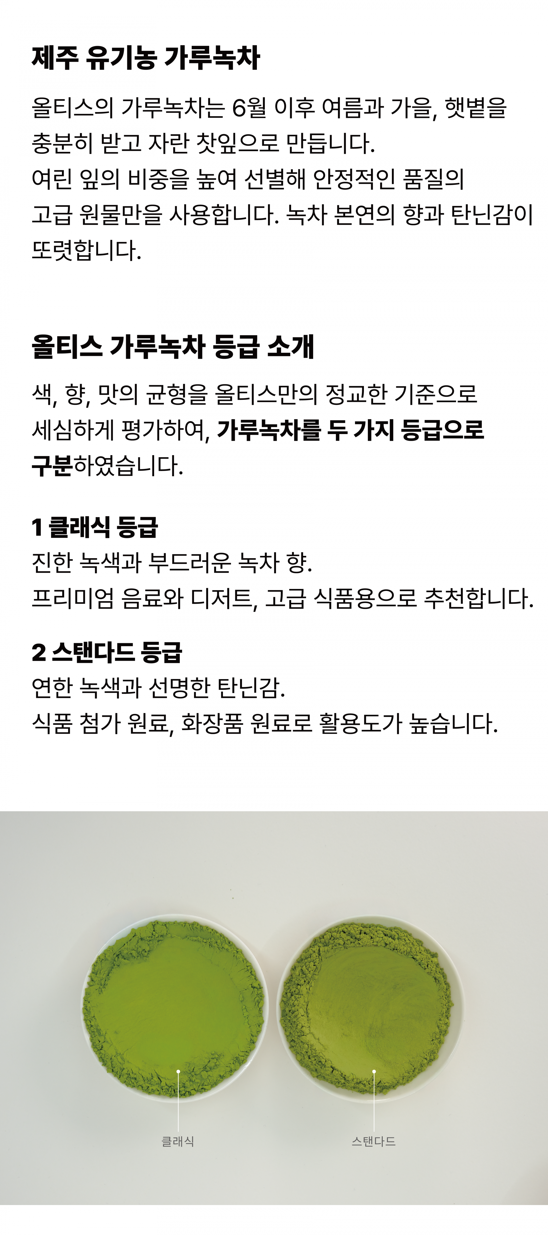 올티스의 가루녹차는 6월 이후 여름과 가을, 햇볕을 충분히 받고 자란 찻잎으로 만듭니다. 여린 잎의 비중을 높여 선별해 안정적인 품질의 고급 원물만을 사용합니다. 녹차 본연의 향이 또렷합니다.